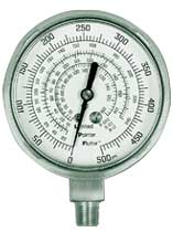 Standard dials have black PSI scale with °F, R12, R22, and R502 (or R134a, R404 and R507) temperature scales in red. PSI-kg/cm2 and PSI/kPa are available with °F or °C temperature scales. Bar with °C scales also available.410a and other scales, special configurations for a wide range of refrigeration applications are available. For more information,contact us at 800/323-5111